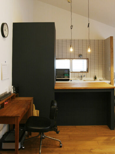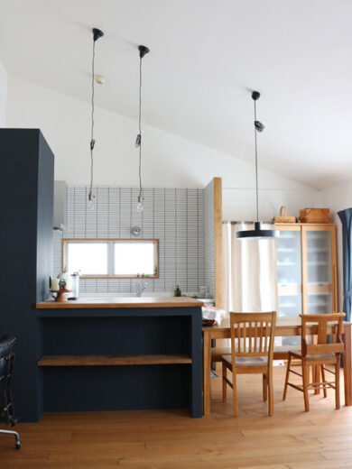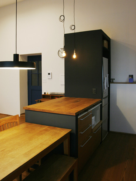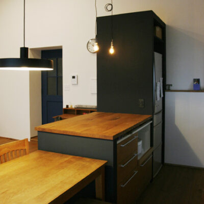 キッチンの位置を変えて家具と造作カウンターでコンパクトだけど使い勝手のいいキッチンの配置に変更。