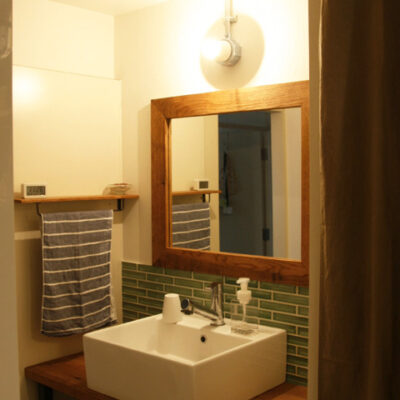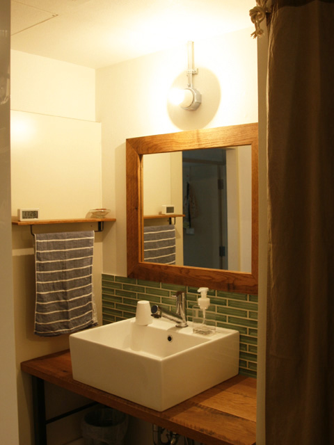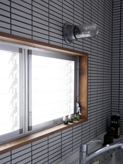 キッチン周りの壁、洗面台は違う種類のモザイクタイルで飾りました。