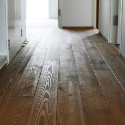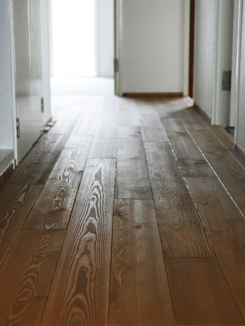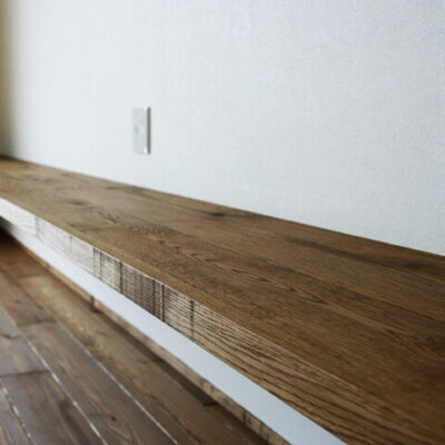 床には無垢フローリングを使用し、壁に一枚もののTVカウンターを設置しました。