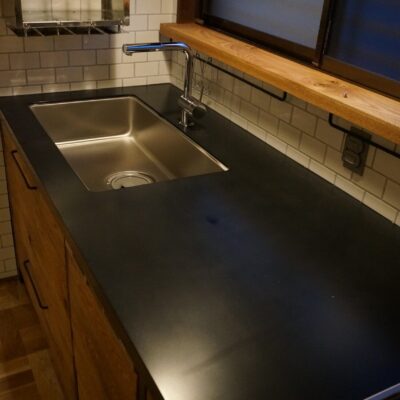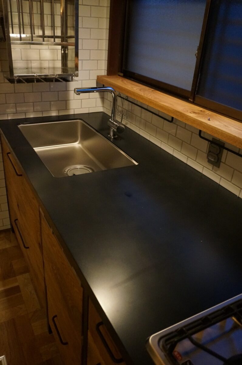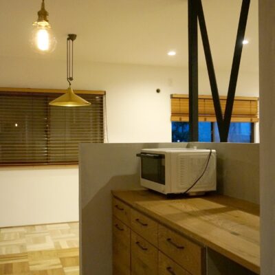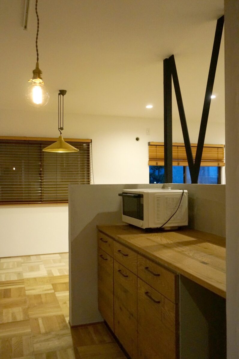 背面にはモルタル風塗装の腰壁に囲われたカウンター収納も造作しました。