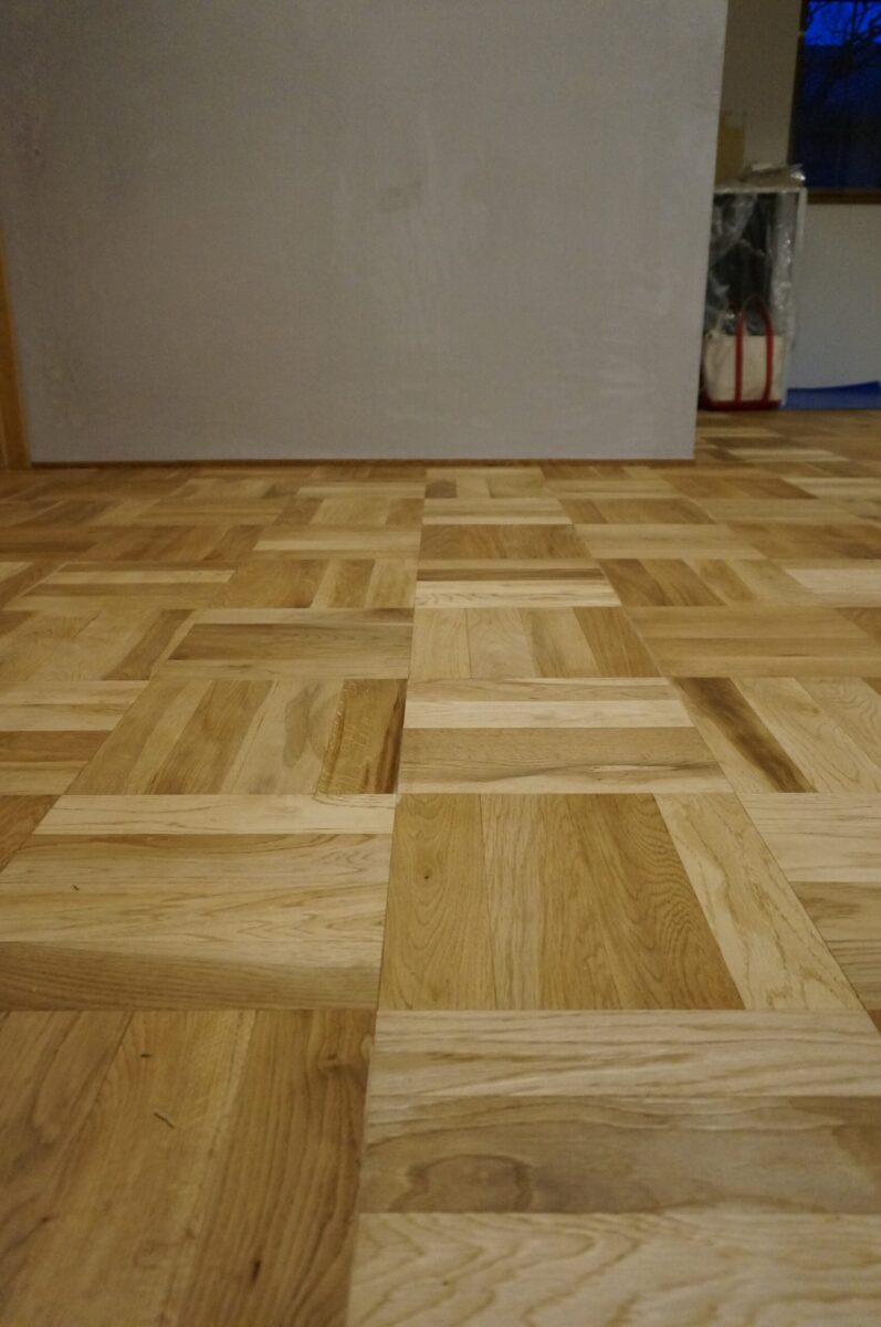 フローリングは玄関・LDK共に寄木張り工法の一種でパーケットフロアで仕上げました。