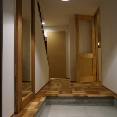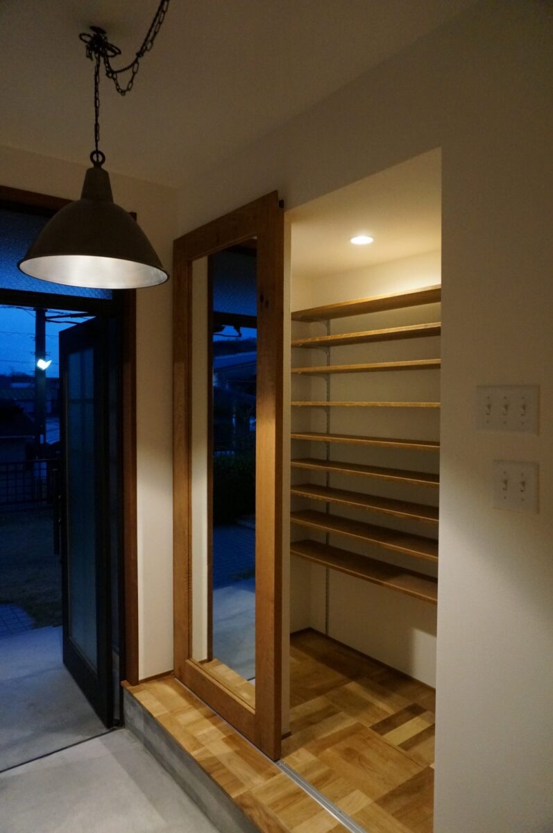 玄関にミラースライドドアをシューズクロークを設置しました。