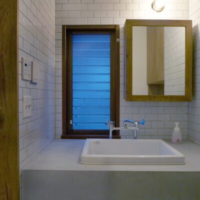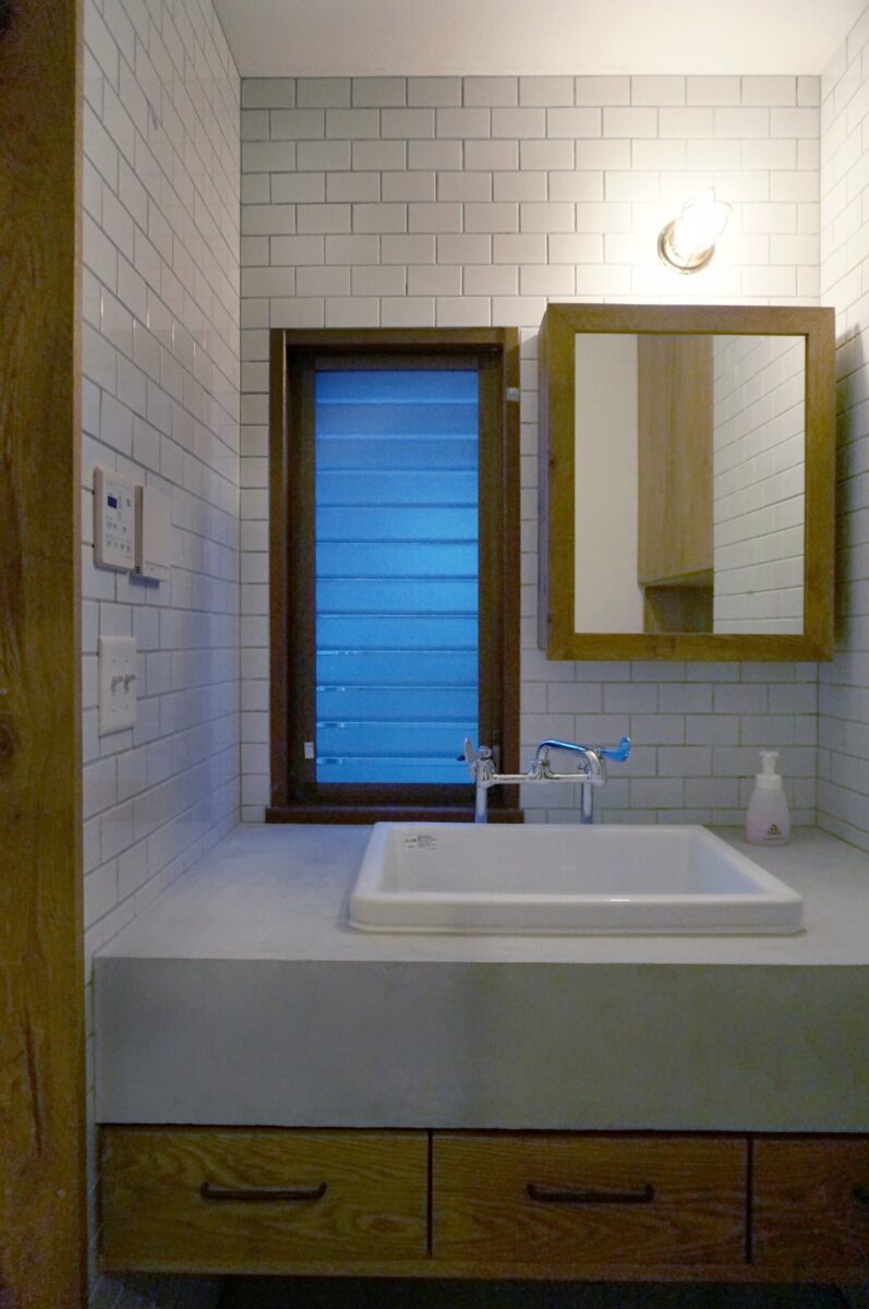 腰壁と同じ塗装材のモルタル風塗装で、洗面台の台とトイレのカウンターも仕上げました。