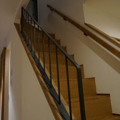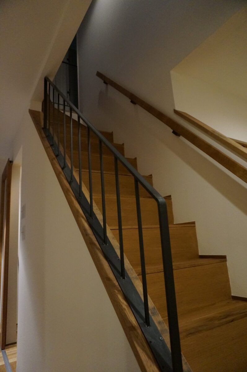 階段手摺と2階の手摺フェンスはアイアンで造り、つや消しクリア塗装で仕上げました。