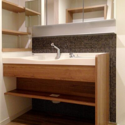 洗面台はモザイクタイルによく合う木の造作洗面台。