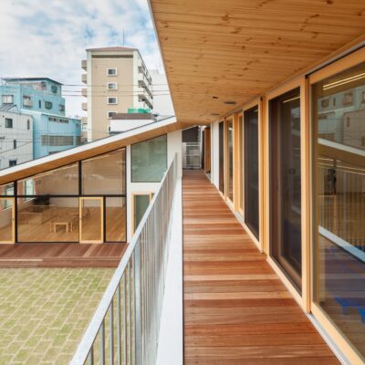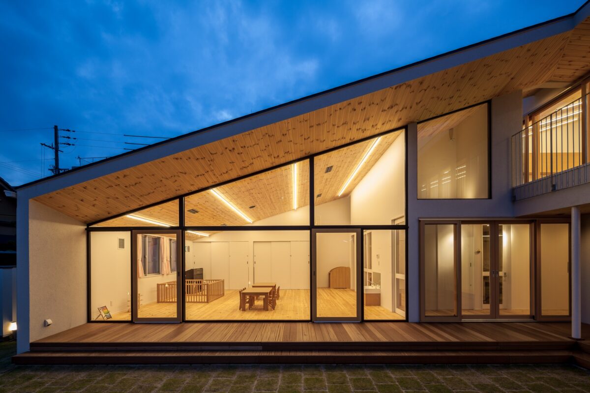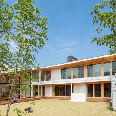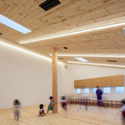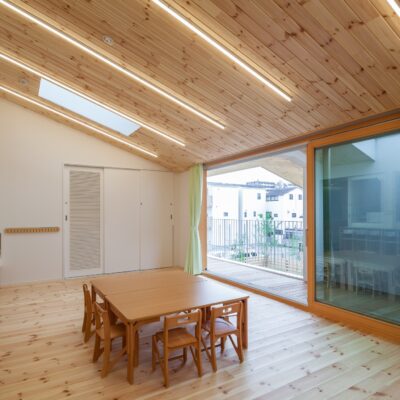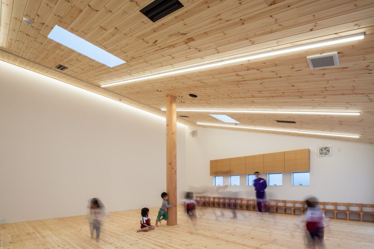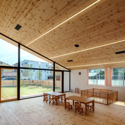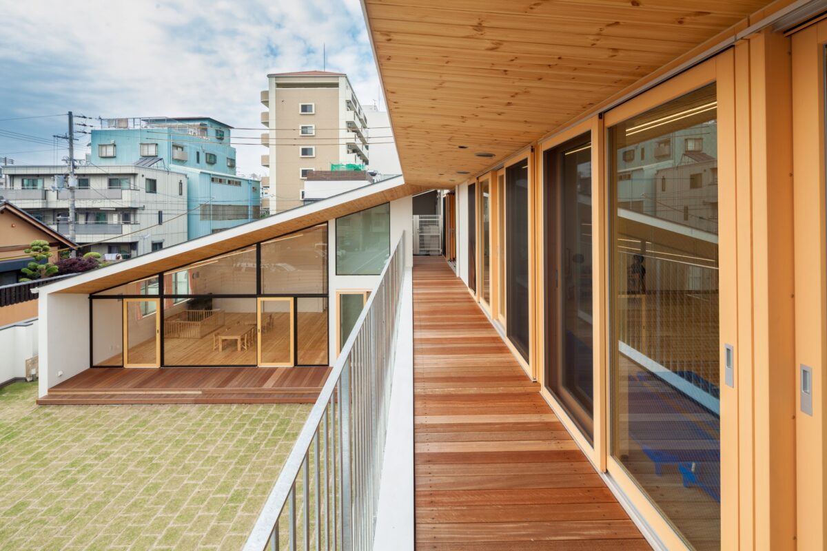 子供達が安全にのびのびとすごせることを考えて設計された木造2階建ての保育園施設。