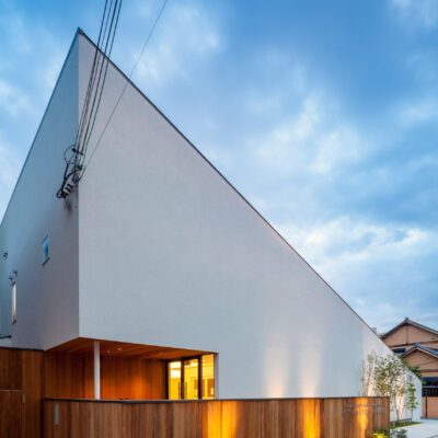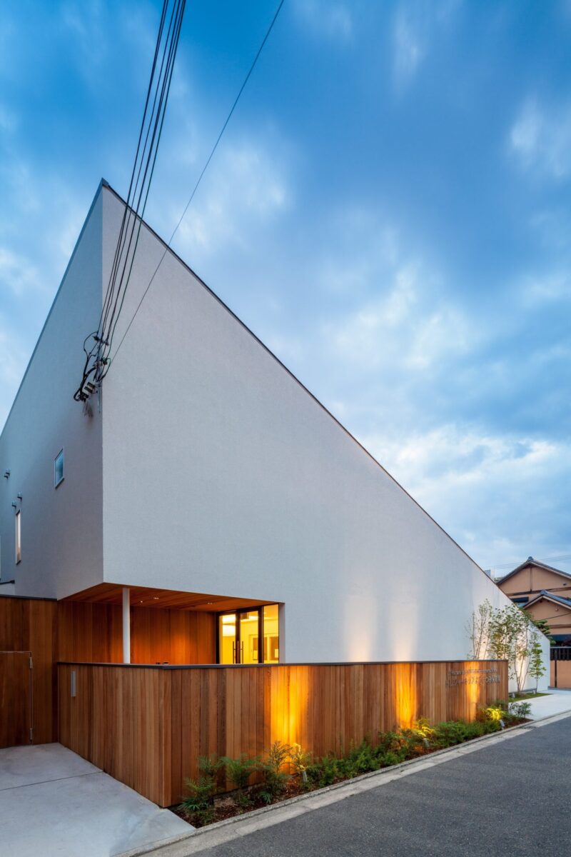 正面外観は町になじむ白をベースとし、木のエントランスをぬけると室内は床、天井に無垢の木を使用し木の落ち着きを感じる仕上げになっている。
